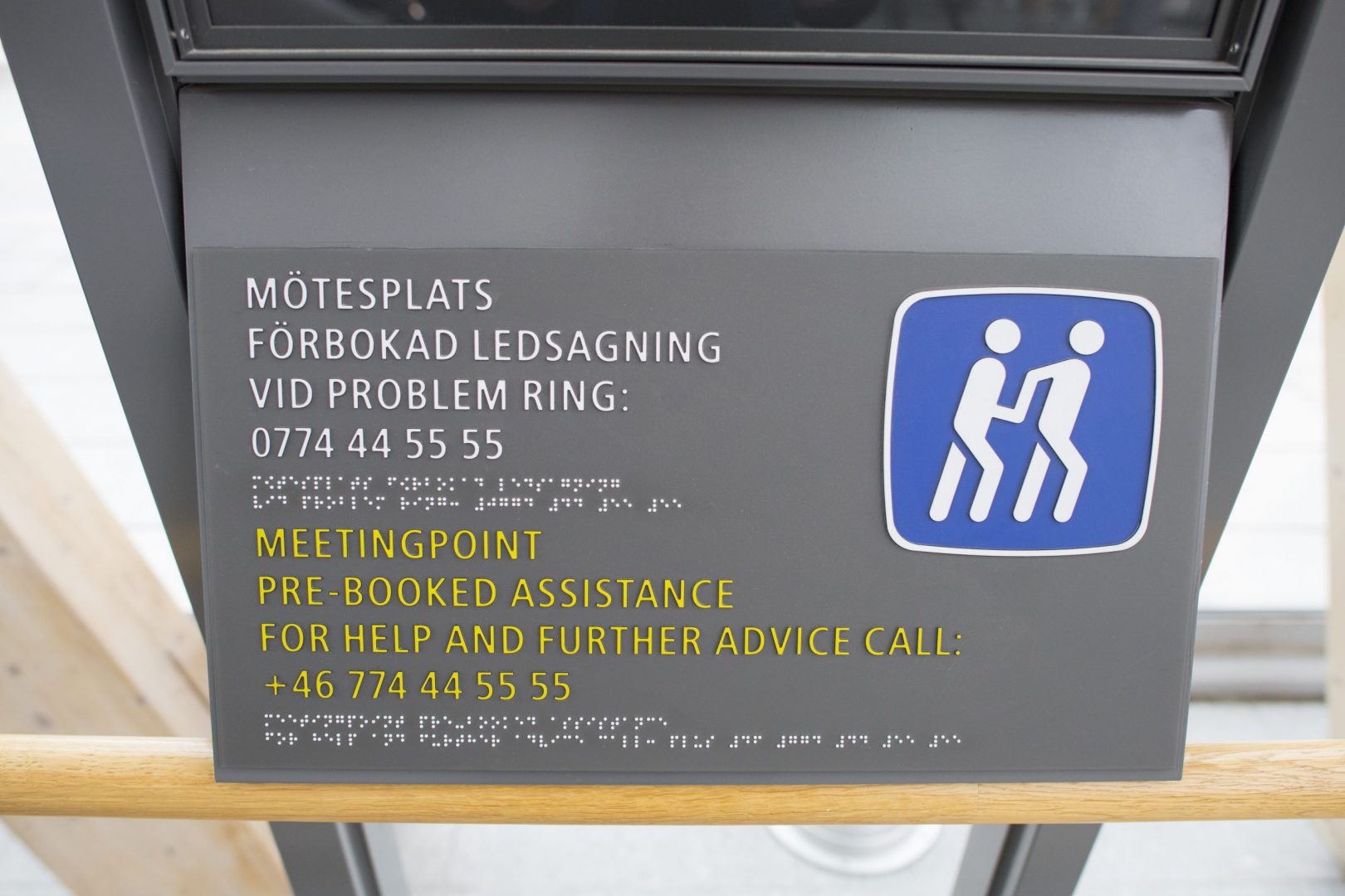 Ledarhundar får följa med i alla vagnar. Meddela att du planerar att ha ledarhund med dig då du bokar resan. I tågen finns automatiska högtalarutrop som anger nästa station.