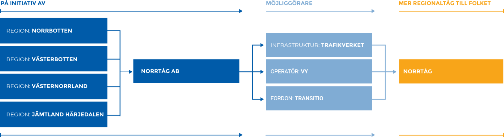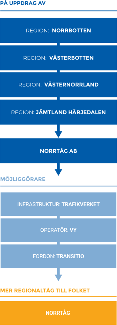 Norrtåg AB ägs av Regionala kollektivtrafikmyndigheterna och länstrafikbolag. Trafiken finansieras av de fyra nordligaste regionerna tillsammans med staten och biljettintäkter. Norrtåg AB är upphandlare och beställare av trafiken, samtidigt som vi arbetar aktivt för att utveckla förutsättningarna för att fler ska kunna välja tåget regionalt genom exempelvis tidtabellsprocesser med andra parter.